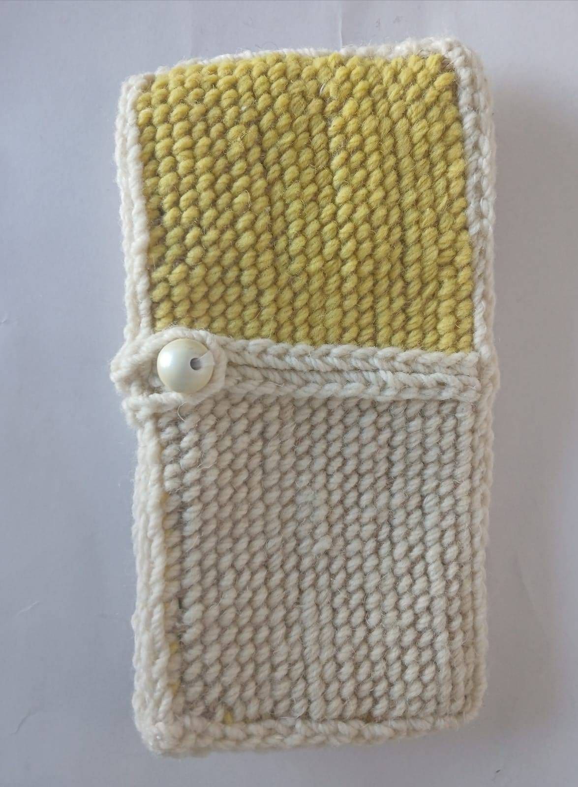 Esta carteira artesanal em sarapilheira é feito à mão com fios macios e resistentes, combinando tons suaves de bege e amarelo que transmitem calma e boa energia.