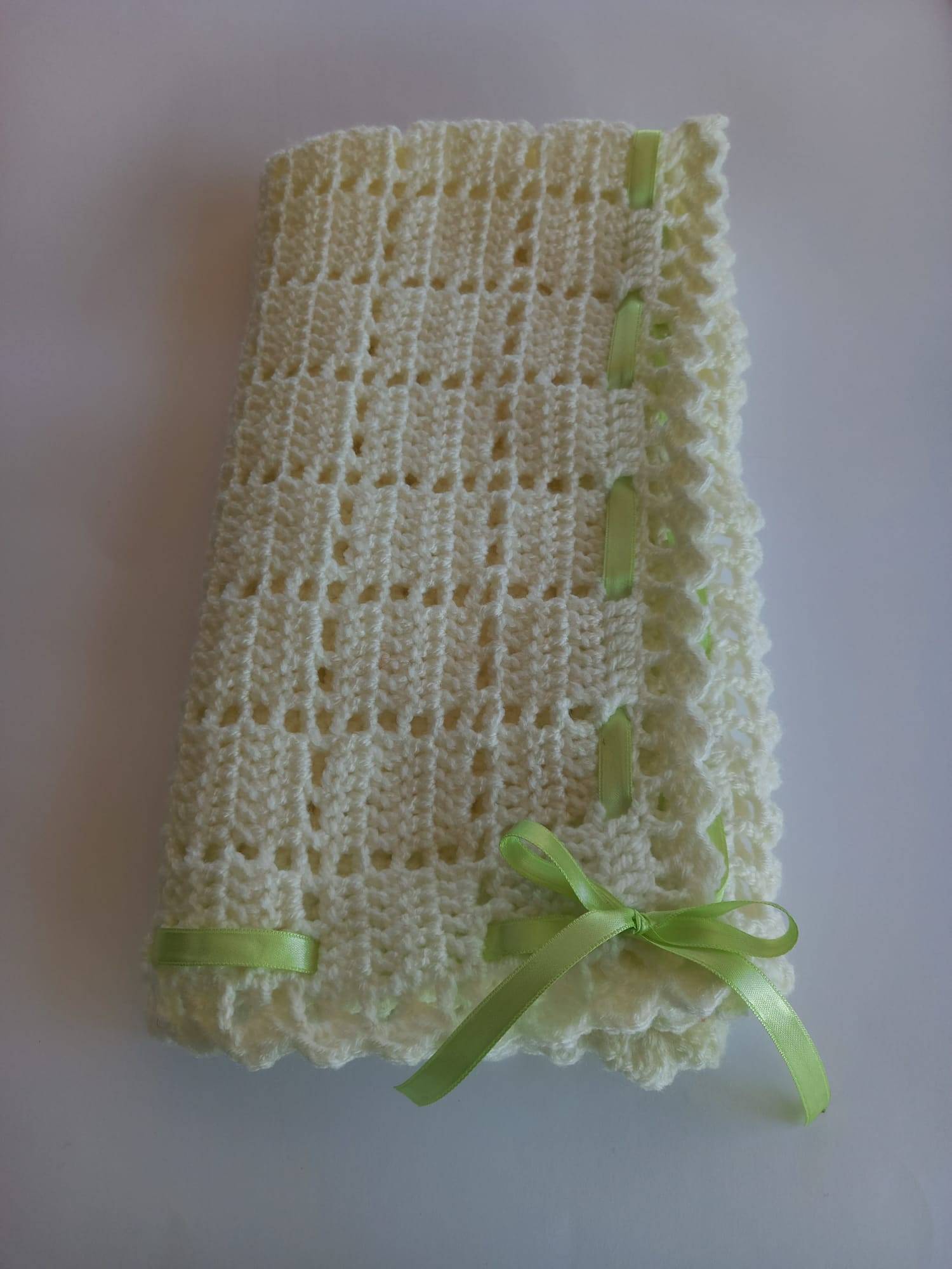 A manta de bébé é uma peça artesanal em croché que combina delicadeza, suavidade e charme intemporal. Produzida à mão em fio macio de tom branco, é adornada com fitas de cetim verde, que acrescentam um toque de cor e elegância discreta.