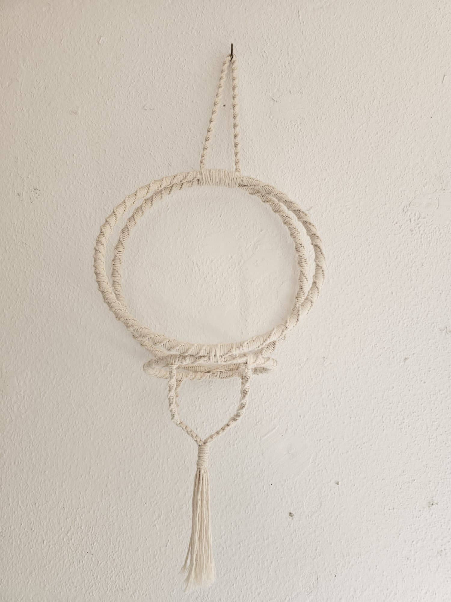 O centro aberto permite encaixar um pequeno vaso, criando uma peça decorativa única, perfeita para pendurar na parede e destacar plantas naturais ou artificiais. O seu estilo minimalista e neutro adapta-se facilmente a qualquer tipo de decoração, do boémio ao moderno.