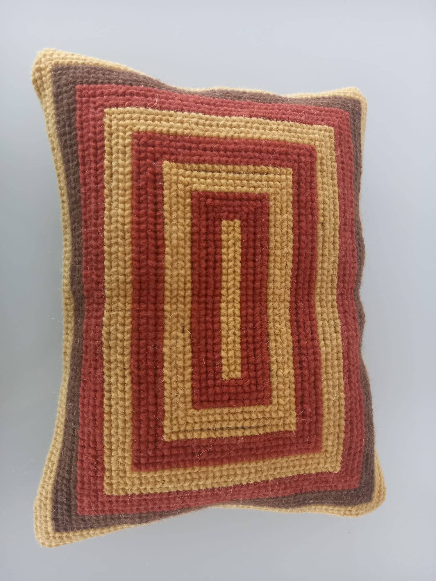 A almofada traz o equilíbrio perfeito entre conforto e cor. Produzida em arraiolos artesanal, combina Amarelo, castanho e laranja, criando uma peça que transmite calma e harmonia.