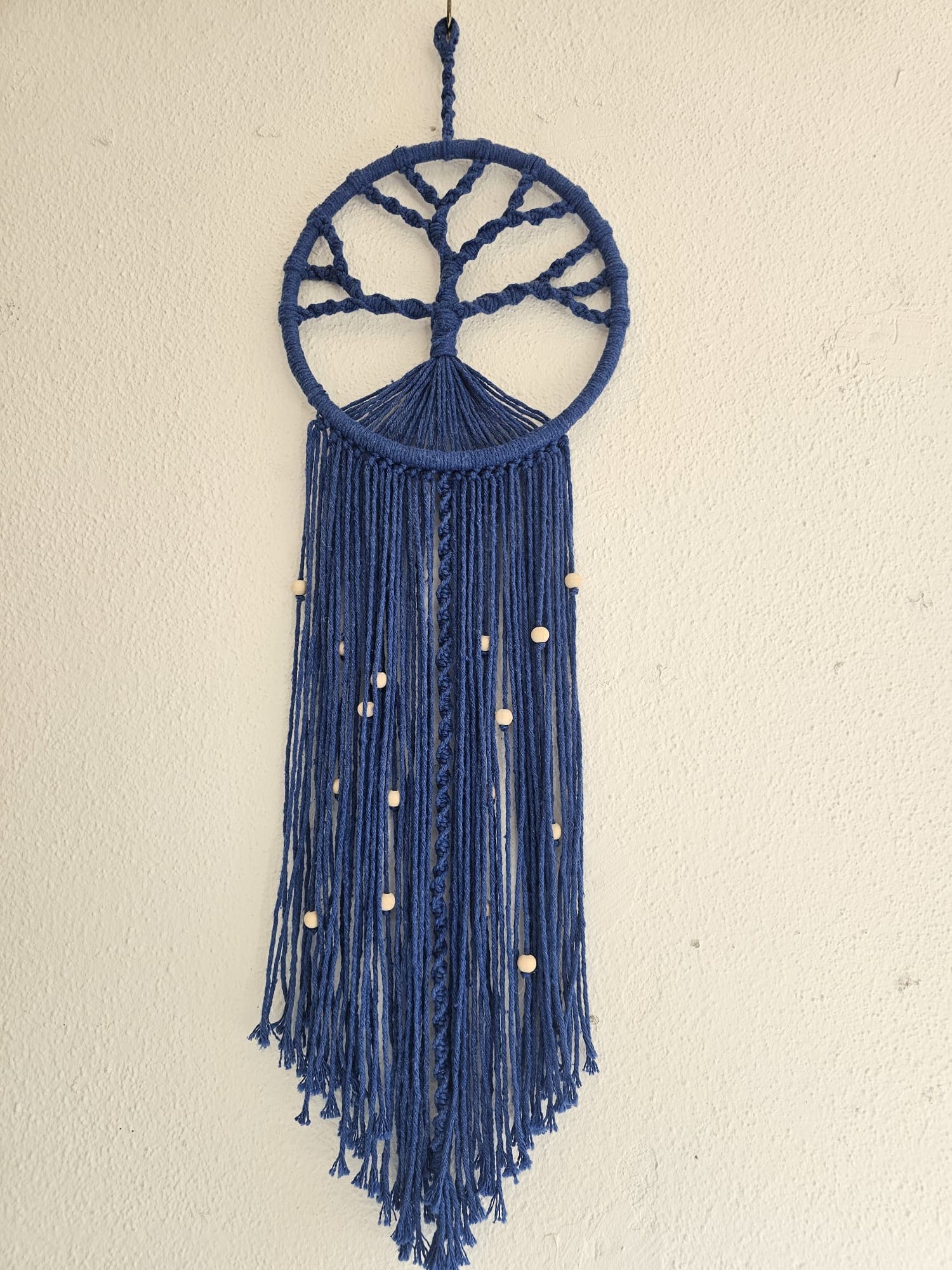 O seu design delicado combina nós e entrelaçados que formam uma árvore dentro de um aro de madeira, com fios longos que criam movimento e suavidade. Ideal para quem procura uma decoração com significado, transmitindo paz e energia positiva a qualquer espaço.