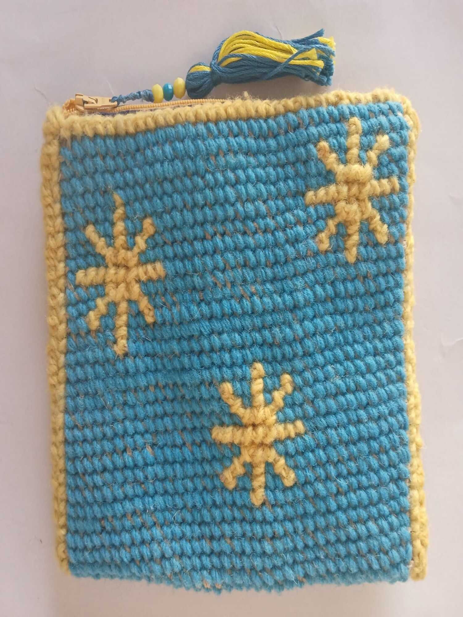 Cheia de cor, textura e alegria! Esta bolsa artesanal em sarapilheira é uma peça única, feita em tons vibrantes de azul e amarelo, criando um padrão divertido inspirado no sol.