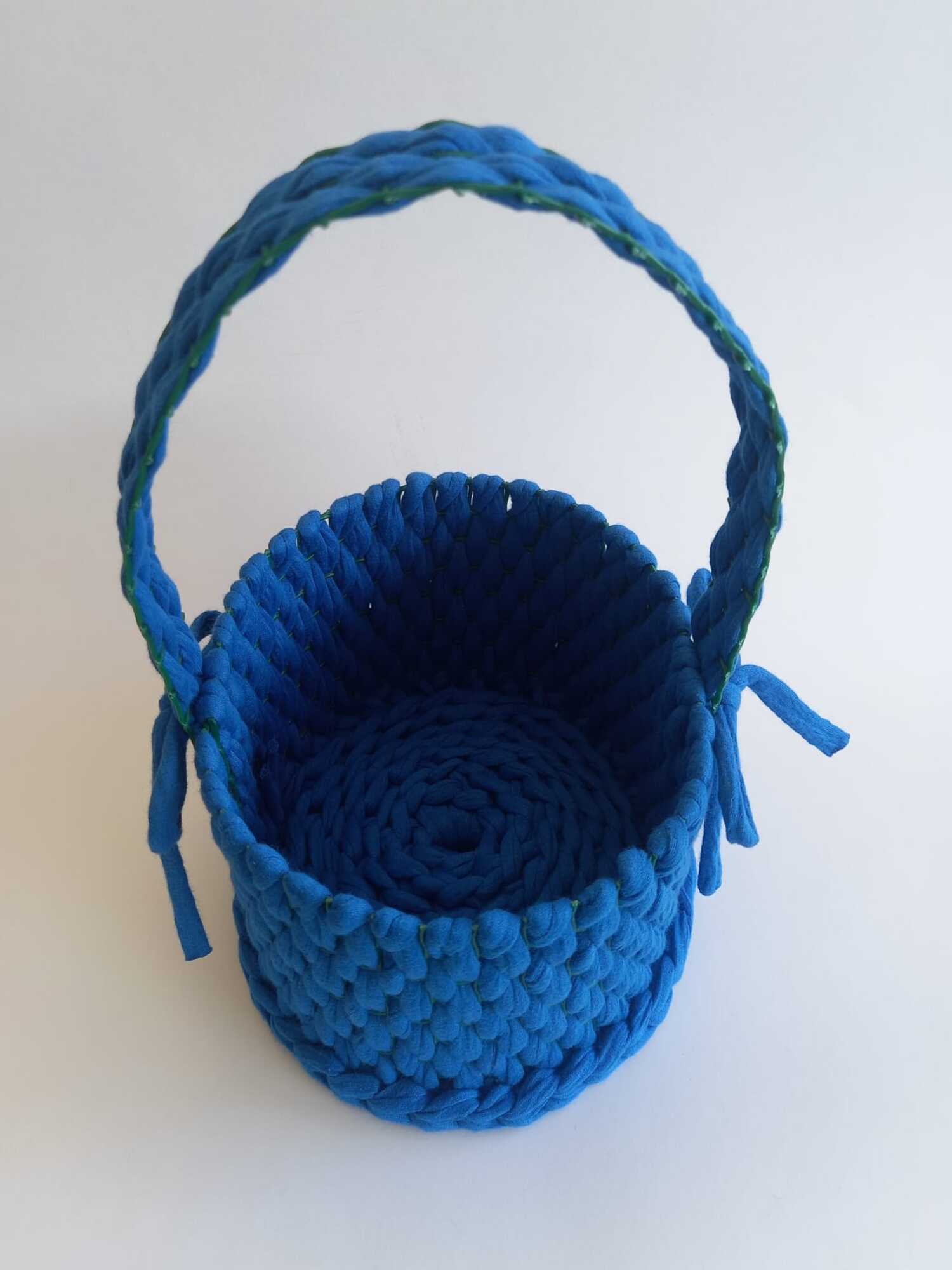 Este cestinho artesanal em fio de licra é a combinação perfeita entre decoração e utilidade. Com o seu tom azul vibrante e acabamento cuidadosamente feito à mão, é uma peça acolhedora que traz cor e personalidade a qualquer espaço.